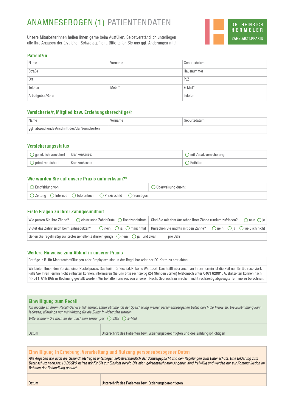 Der Anamnesebogen umfasst Fragen zu Ihrer Person (Seite 1) und zu Ihrer Gesundheit (Seite 2). Bitte nehmen Sie sich einige Minuten Zeit, unsere Fragen zu beantworten. Damit helfen Sie uns, die Behandlung so angenehm und sicher wie möglich zu gestalten. Sie können den Anamnesebogen bequem zuhause ausdrucken und in Ruhe ausfüllen.